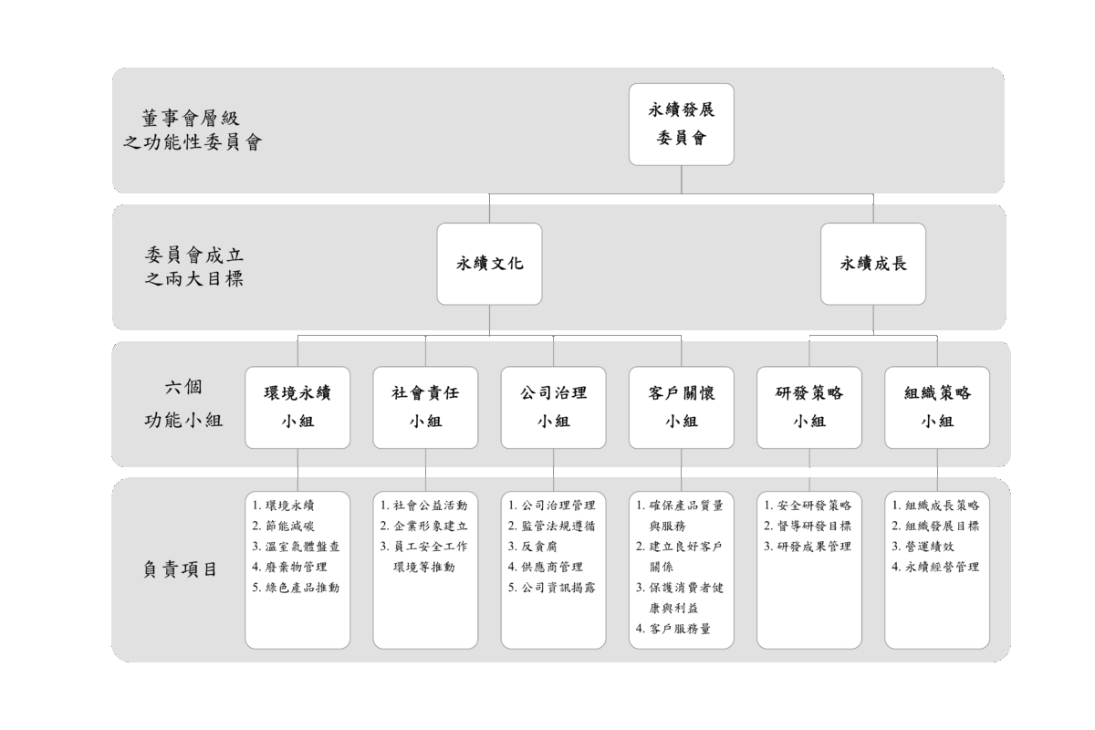 本公司於2022年8月11日經董事會決議通過成立專責之「永續發展委員會」,並於2025年8月12日由原隸屬「總經理室」提升為直接隸屬董事會之專門委員會。委員會依功能目標分為「永續文化」與「永續成長」兩大推動面向:「永續文化」之目標建立下,設有環境永續小組、社會責任小組、公司治理小組及客戶關懷小組;「永續成長」之目標建立下,設有研發策略小組及組織策略小組。永續發展委員會定期彙整執行成果及重要議題,並每年向董事會報告永續推動現況,以提升永續治理之透明度與有效性。